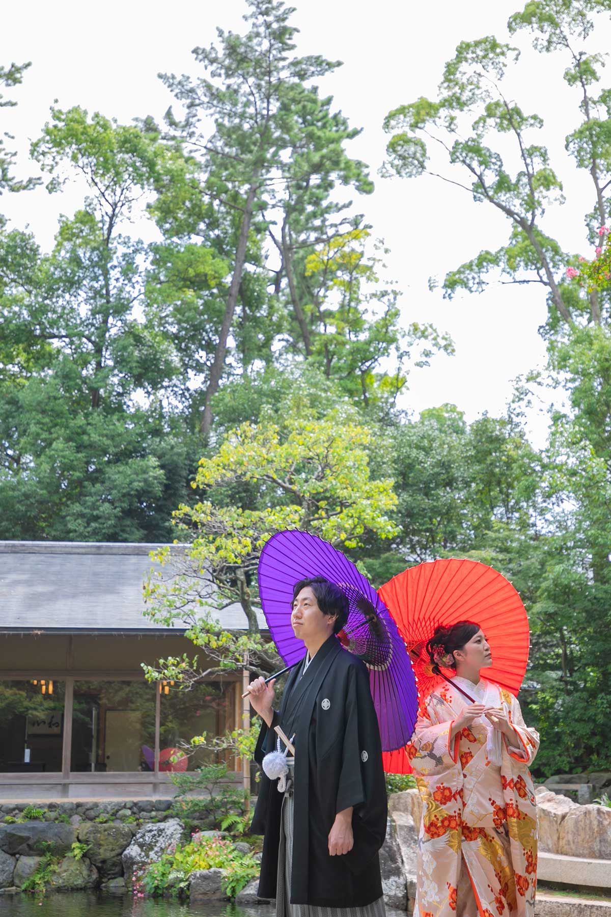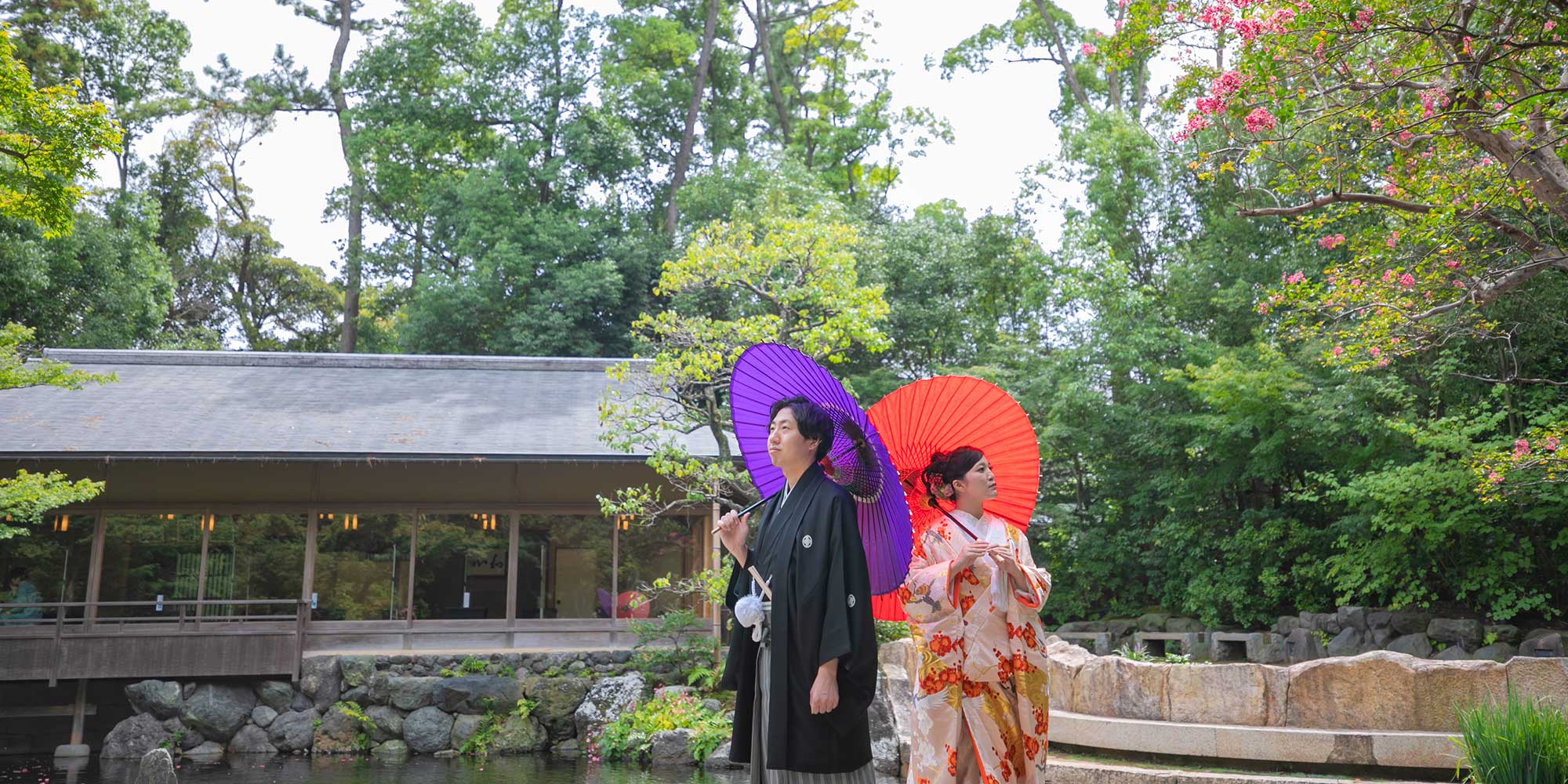 本殿の奥に位置し、寒川神社で祈願を受けた人だけが足を踏み入れることのできる特別な庭園。それが『神嶽山 神苑(かんたけやま しんえん)』。池泉回遊式の日本庭園は目に映るものすべてが瑞々しく、四季折々の美しさに満ちています。限られた人だけに許される特別なロケーションフォトはきっと二人の一生の宝物になるはず。