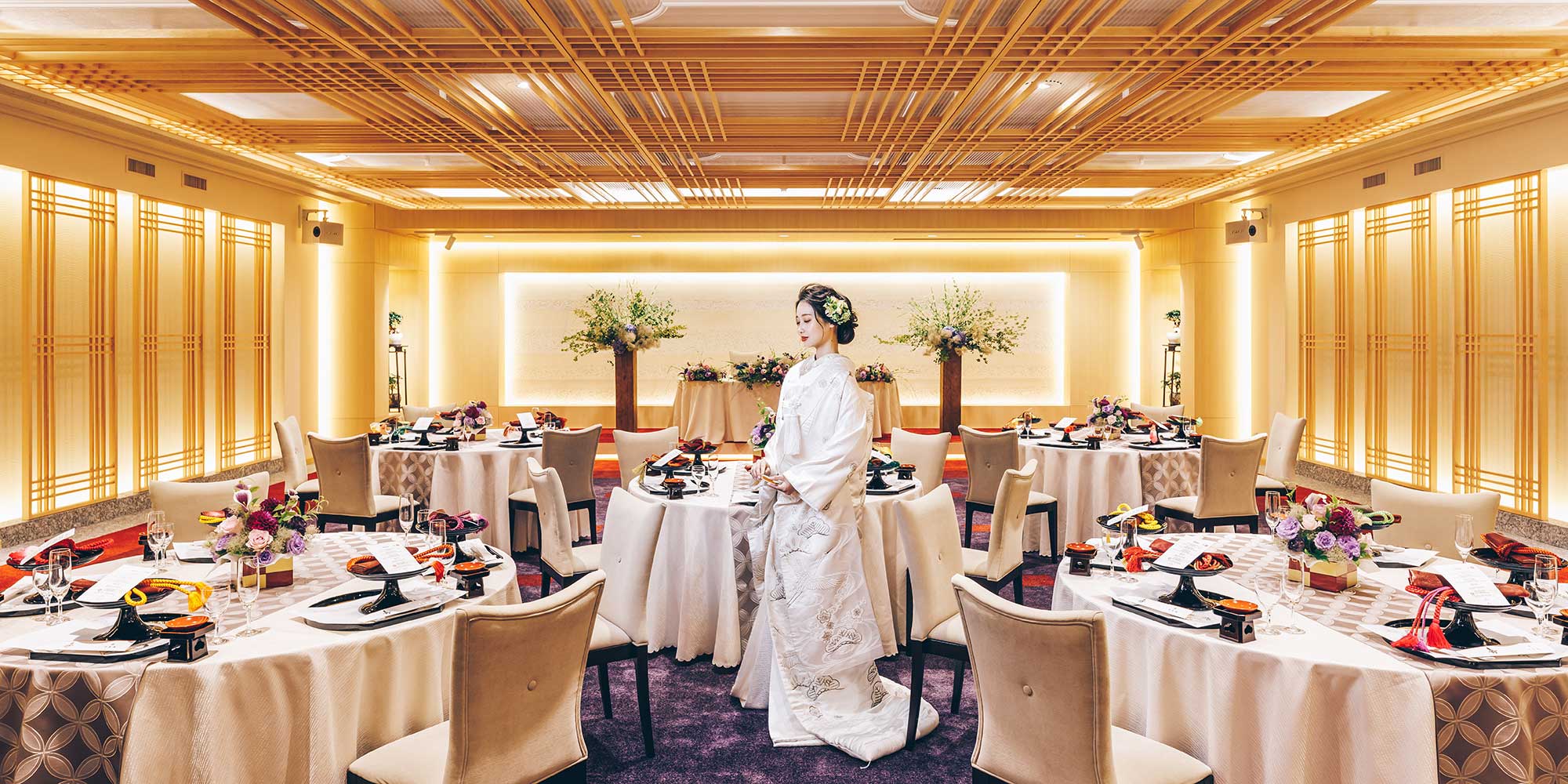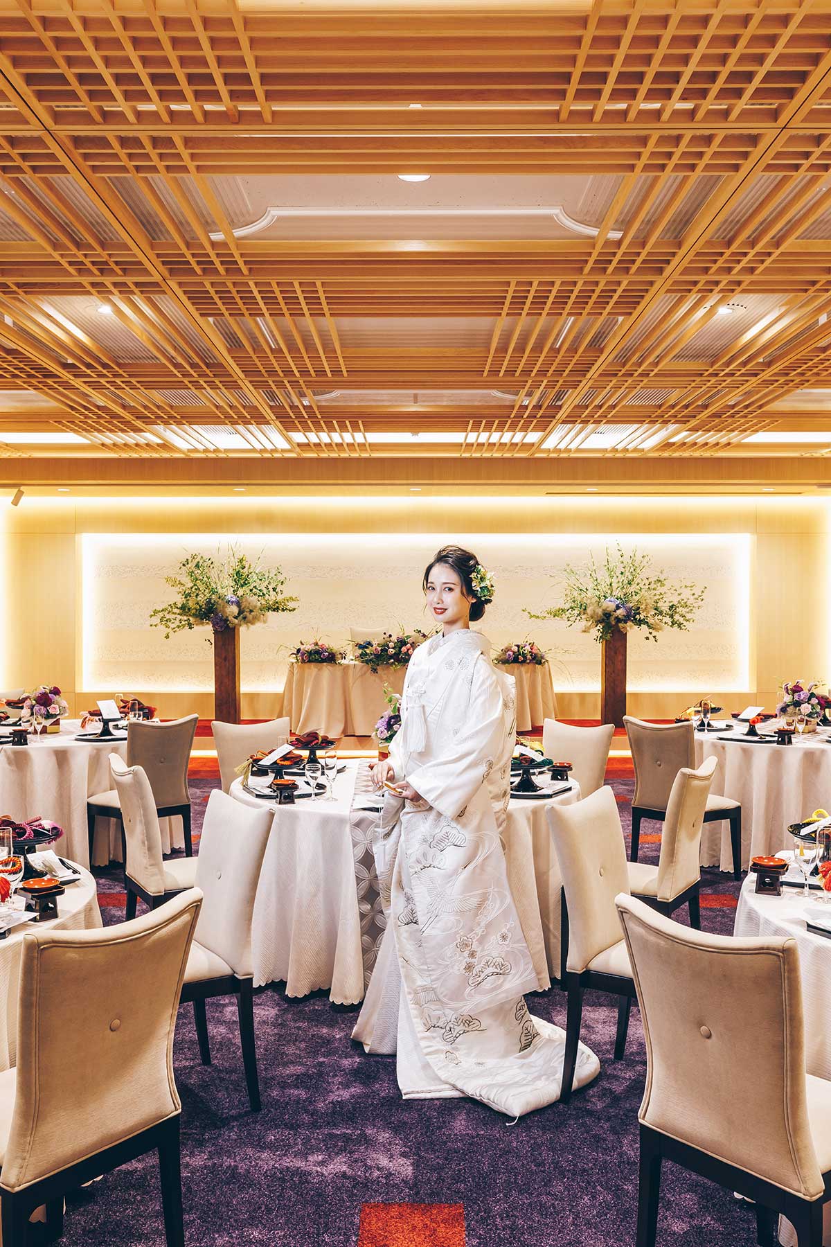 厳かな神前結婚式のあとはリラックスムードで披露宴を楽しんで。クラシカルな美しさに和装が映える披露宴会場『天平』をはじめ、人数やテイストに合わせて、さまざまな披露宴会場から選べます。人気のフレンチはもちろん、幅広い年齢層の方に喜ばれる和食もご用意しています。