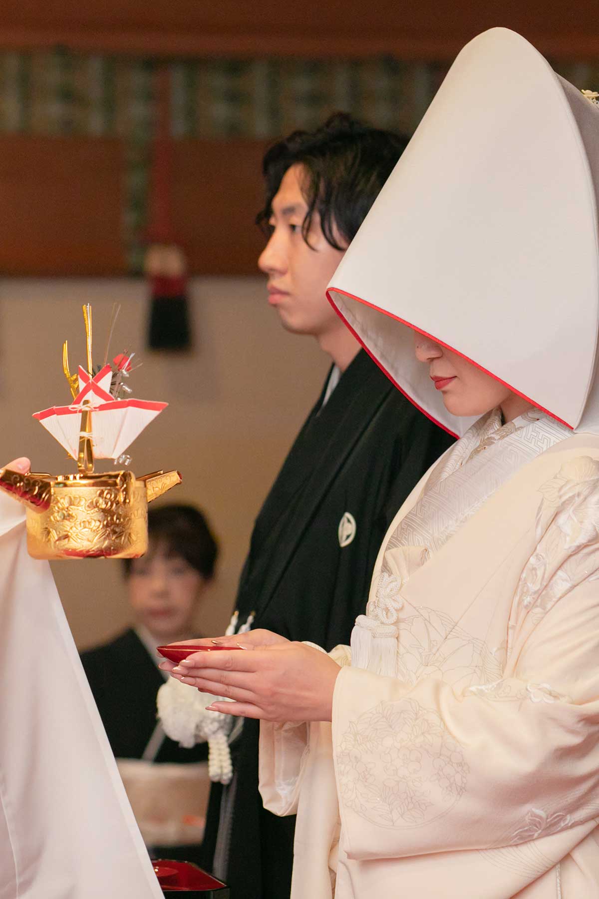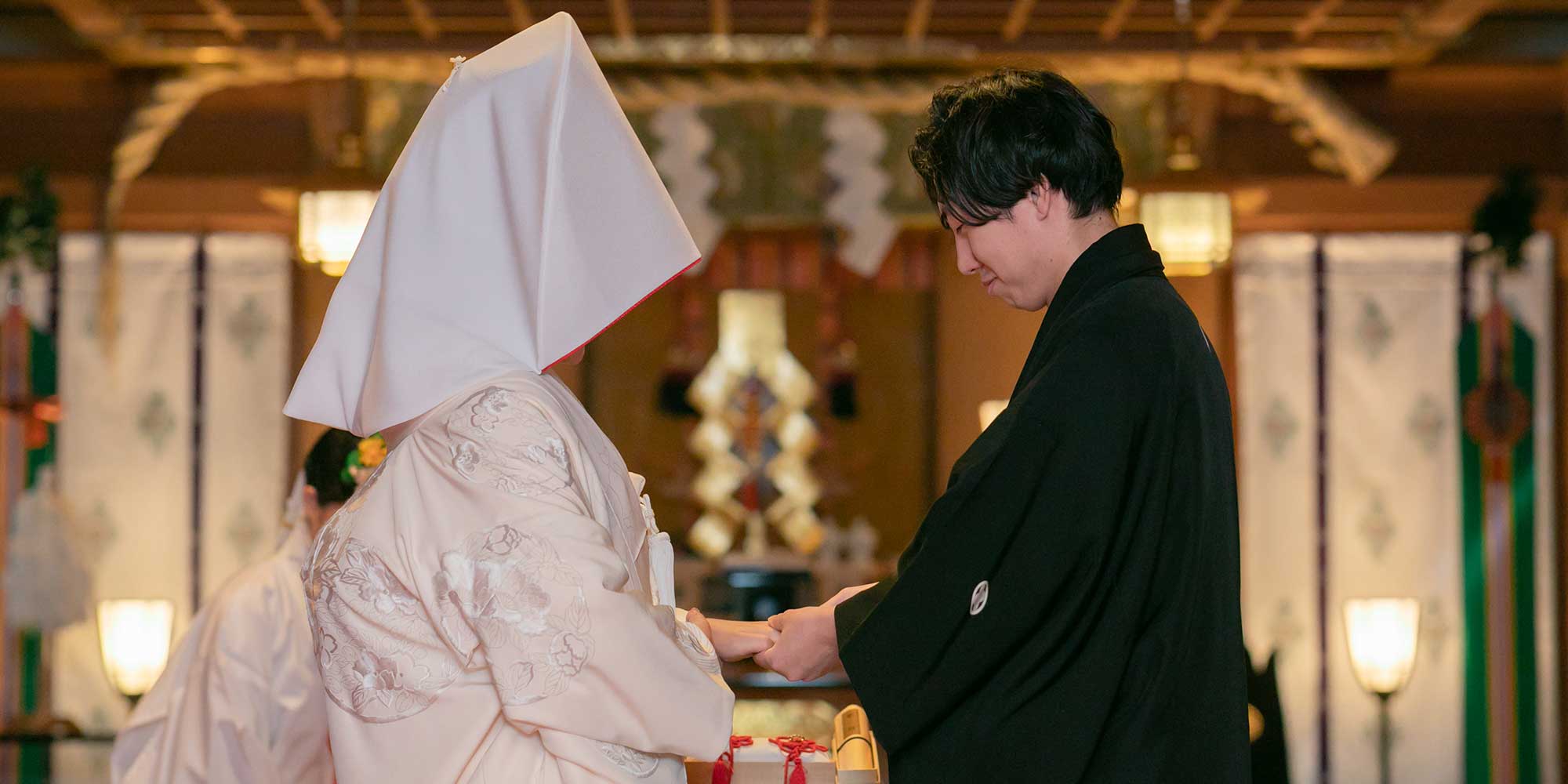 いよいよ結婚式当日。隣接の参集殿で花嫁支度を済ませたら、清められた参道を通って本殿へ。神門をくぐって廻廊を進む時、二人の人生が歩み始めます。