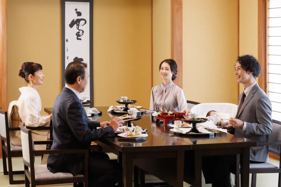 ご祈祷後のご会食のひとときは個室でゆっくりとお過ごし頂けます。食事の開始時間は11:00又は14:00からお選び下さい。